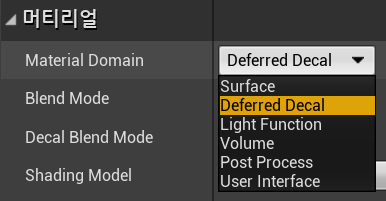 머터리얼의 'material domain' 속성이 'deferred decal'이어야 합니다.