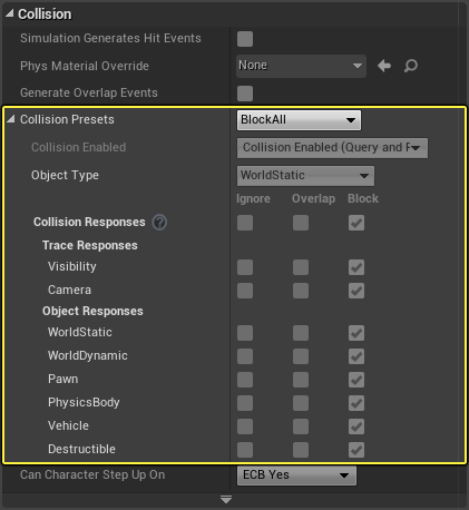 즉, 콜리전 프리셋이란 바로 해당 오브젝트가 다른 오브젝트, 트레이스와 어떤 상호작용을 할건지 선언한 것이라고 할 수 있습니다.