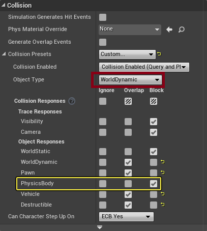 - 오브젝트 타입 : WorldDynamic - PhysicsBody 타입과의 상호 작용 : Block |