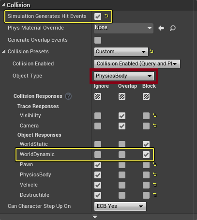 | - 오브젝트 타입 : PhysicsBody - WorldDynamic 타입과의 상호 작용 : Block - Simulation Generates Hit Events : 활성화 |