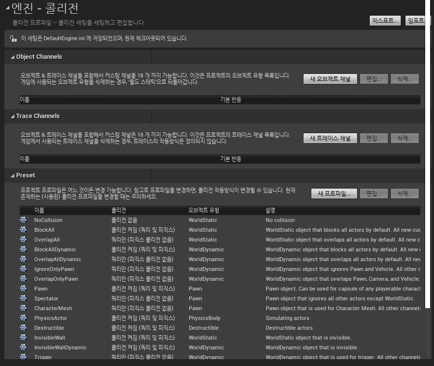 오브젝트 디테일의 콜리전 란에서 손쉽게 콜리전을 설정하기 위해 미리 정의해두는 프리셋입니다.